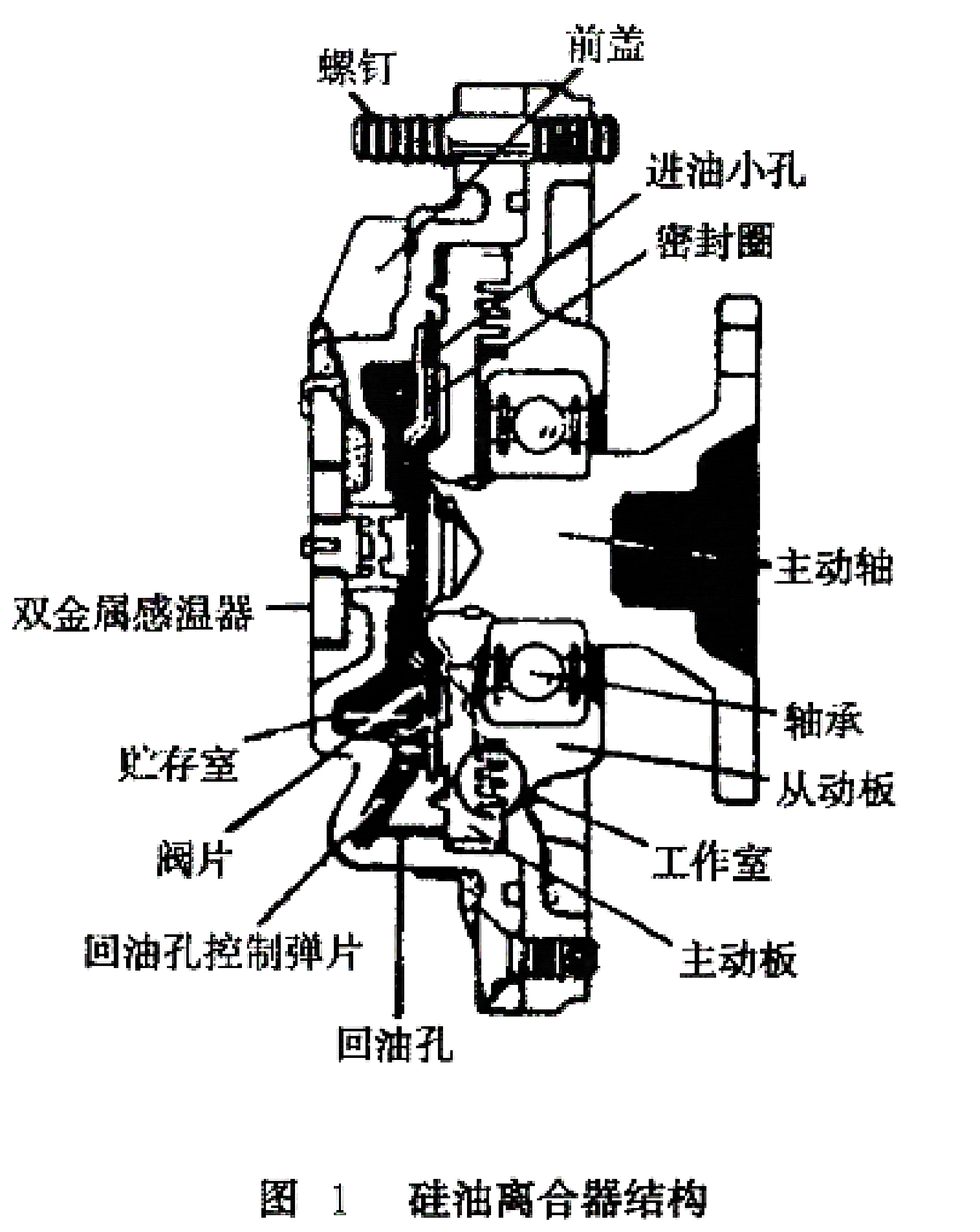 粘性的硅油流进主动板与从动板及主动板与离合器壳体之间的间隙中,将主动板上的转矩传给离合器壳体,带动风扇高速旋转,离合器此时处于接合状态。进入工作腔的硅油在离心力的作用下甩向外缘,顶开单向阀1并通过从动板上的回油孔B流回贮油腔,然后再进入工作腔。如此反复,形成循环。硅油在循环时将热量传给铸有散热片的前盖和离合器外壳而得到冷却,以避免工作时硅油温度过高。
