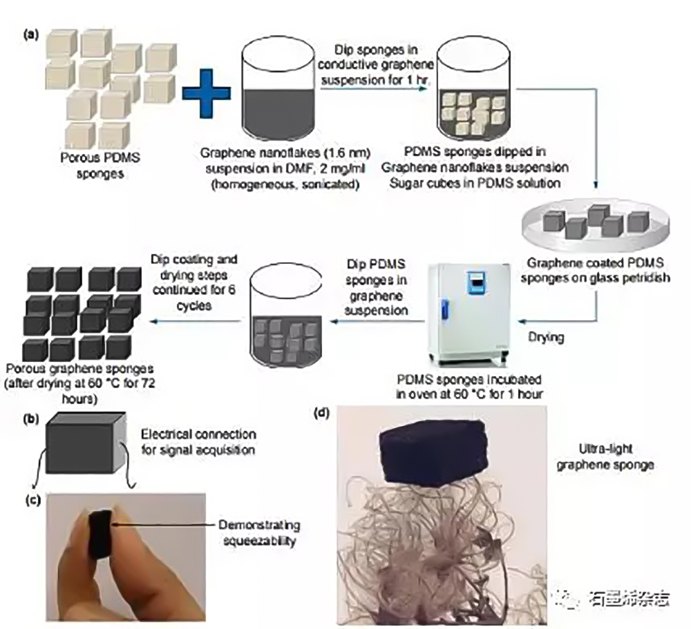 1. 可压缩石墨烯-PDMS泡沫传感器的制备:(a)多层石墨烯纳米薄片(MLG)渗透PDMS泡沫的示意图;(b)具有电触点的单一PDMS-MLG泡沫传感器的示意图:(c)石墨烯-PDMS泡沫传感器的(c)可挤压性和(d)超轻性。