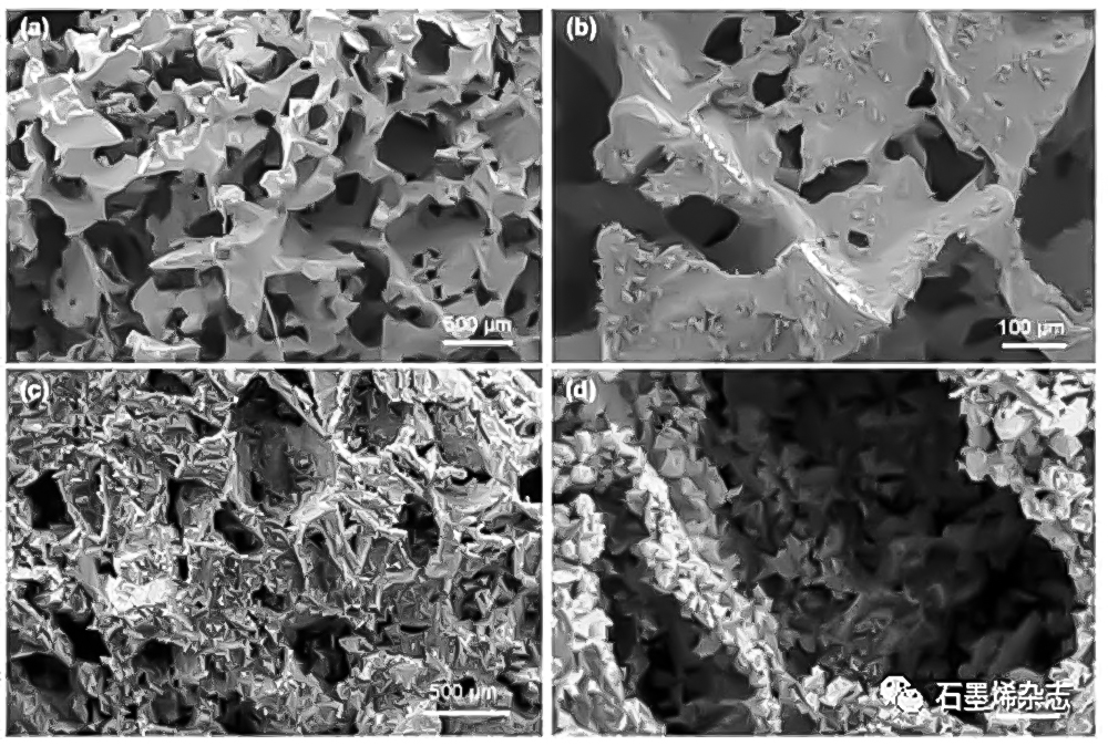 2. 负载MLG前后PDMS泡沫的SEM图:(a, b)不同放大倍数下未PDMS泡沫体的多孔结构;(c, d) 载有MLG两种不同放大倍数的PDMS泡沫,其孔壁被MLG纳米薄片覆盖,形成一个纳米材料渗透网络。