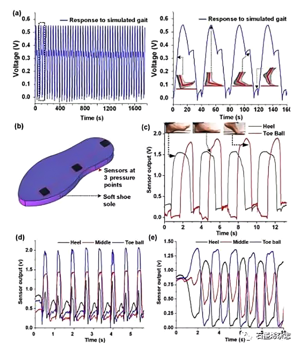 6. 石墨烯- PDMS泡沫传感器在人体步态监测中的应用:(a)传感器对模拟步态的响应图;(b)软鞋底传感器组件(SSA)示意图;(c)显示步行时脚趾球和脚后跟区域的传感器响应图;(d)显示跑步时脚趾球、足弓和脚后跟区域的传感器响应图;(e)显示周期性前后倾时脚趾球、足弓和脚跟区域的传感器响应。
