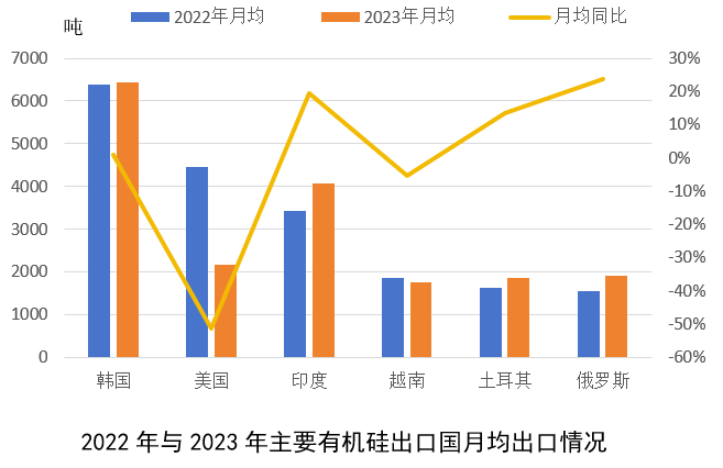 2.对美有机硅出口自2022年7月之后大幅下滑,2023年月均出口同比大降超50%,美国作为我国有机硅第二大出口国地位被印度取代