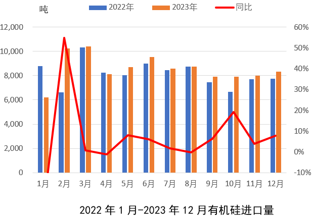 2023年1-12月我国有机硅累计出口量为40.66万吨,同比减少10.3%;累计进口量为10.27万吨,同比增加5.1%