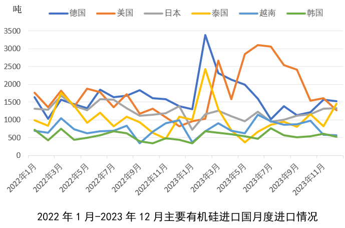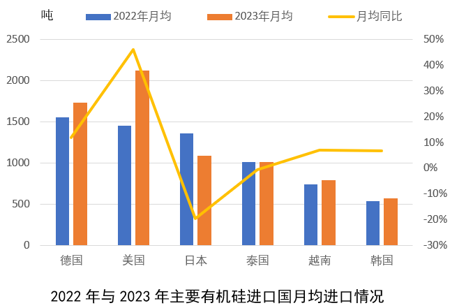 1.2023年1-12月,对美国和德国有机硅进口大幅增加,月均同比增加分别约46%与12%,美国重新成为我国最大有机硅进口国