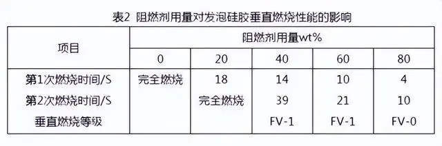 常用于表征聚合物阻燃性能之一的测试方法为垂直燃烧法,其燃烧模式非常接近物体燃烧的实际情况, 因此能很好地反映硅橡胶的实际阻燃效果。阻燃剂用量对硅橡胶垂直燃烧性能的影响如表2所示。从表2可以看出, 未加阻燃剂的硅橡胶完全燃烧;加入40份阻燃剂的硅橡胶垂直燃烧等级达到FV-1级, 具有一定的自熄能力;加入80 份阻燃剂的硅橡胶垂直燃烧等级更是达到了FV-0级, 表现出良好的自熄性。