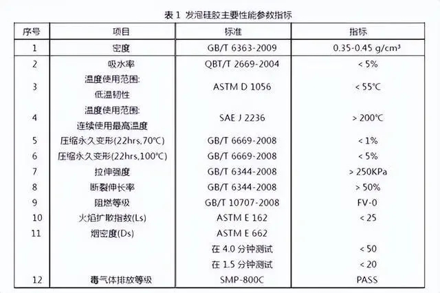 有机硅橡胶基体的密度为1.17g/cm3。但通过发泡处理,当前的成熟工艺中所制备的有机硅橡胶泡沫材料的密度最低可为0.16-0.20 g/cm3,可被用于汽车座椅、头枕等部件;而常规的有机硅橡胶泡沫材料(密度为0.45 g/cm3)则被广泛用于密封、减震等部位的缝隙填充。