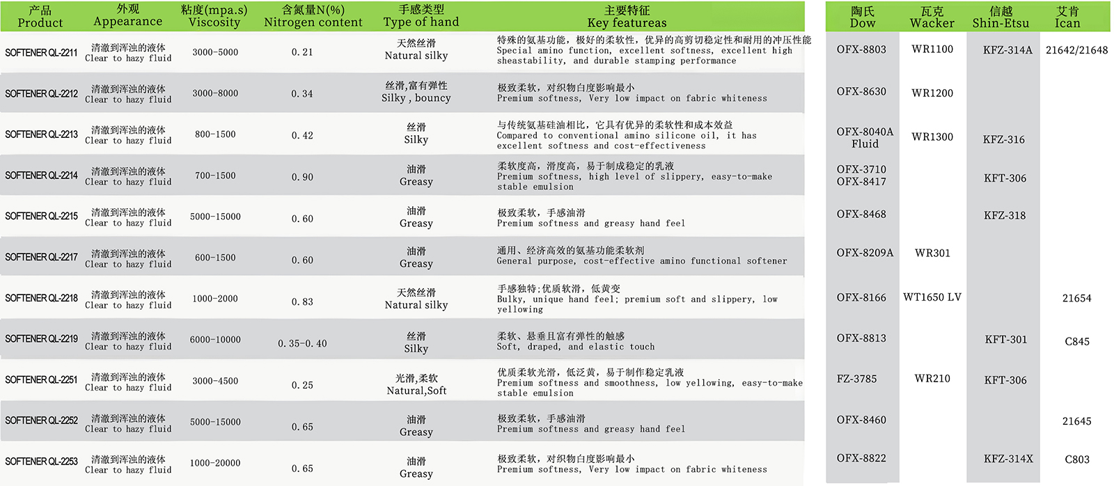 液体流动阻力的量度(单位:mPa・s)。氨基改性硅油的粘度与分子量正相关,同时受分子间作用力(如氢键)和分子结构(如支化度)影响。