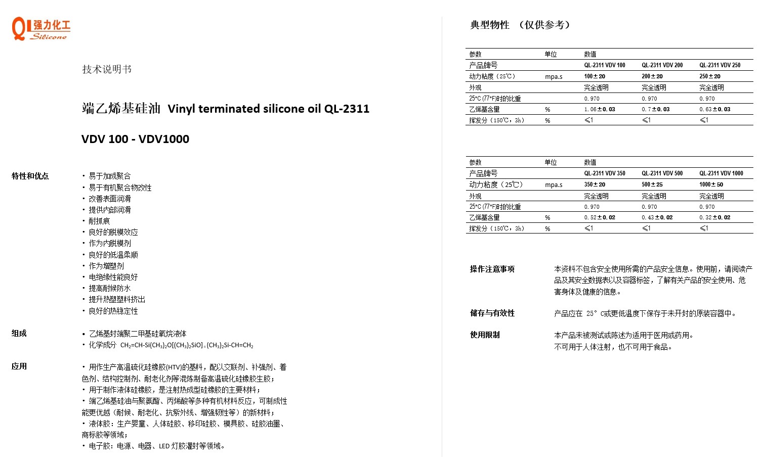 端乙烯基硅油 Vinyl terminated silicone oil QL-2311 VDV 100 - VDV1000