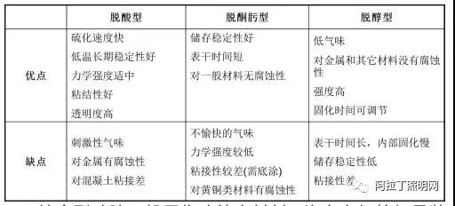 根据交联反应生成的副产物种类,缩合型硅胶又可以细分为脱酸型、脱酮肟型、脱醇型、脱胺型、脱丙酮型、脱酰胺型等六种类型,常见的三类缩合型硅胶的优缺点如下所示。